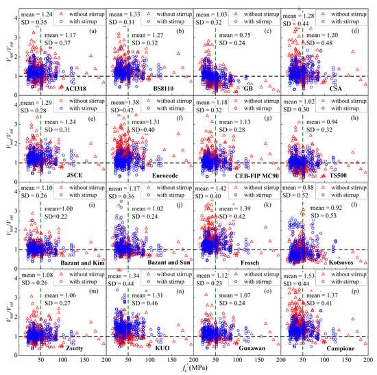 The relationship between the ratios (Vtest/Vcal) and concrete strength of (a) ACI318; (b) BS8110; (c) GB; (d) CSA; (e) JSCE; (f) Eurocode; (g) CEB FIP MC-90; (h) TS500; (i) Bazant–Kim; (j) Bazant–Sun; (k) Frosch; (l) Kotsovos; (m) Zsutty; (n) Kuo; (o) Gunawan; (p) Campione.