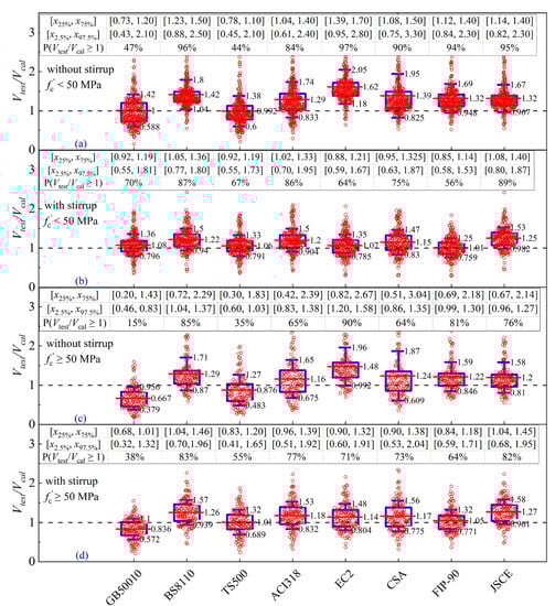 Figure 12a–h show the distribution of strength ratios obtained by national codes against concrete strength. From Figure 13, it is visible that there is a large number of strength ratios yielded from codes except for GB50010 [23] and TS500 [57], which are distributed around the horizontal line at a strength ratio = 1.0. The safety percentile of specimens calculated by each code shows variations in concrete strength to varying degrees. Among them, the predictive results of GB50010 [23] and TS500 [57] constantly retain a low-security level, excluding predicting RC slender beams with stirrup and normal concrete strength, which are 70% and 67%, respectively, higher than CEB-FIP MC90 [30]. Furthermore, the amount of safety specimens obtained by EC2 [4] and CEB-FIP MC90 [30] are apparently influenced by the stirrup. For normal concrete strength, the frequency of Vtest/Vcal ≥ 1.0 of the models by EC2 [4] and CEB-FIP MC90 [30] range from 97% and 94% down to 64% and 56%, respectively, and those for high concrete strength range from 90% and 81% down to 71% and 64%. Compared to the above codes, the BS8110 [38], CSA A23.3 [34], and JSCE [3] models are not sensitive to concrete strength. In predicting the beams with normal and high concrete strength, the safety margins of the model of BS8110 [38] are comparatively high, which are consistently greater than 80%.