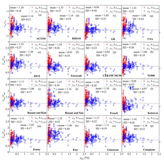 The relationship between the ratios (Vtest/Vcal) and stirrup ratio of (a) ACI318; (b) BS8110; (c) GB; (d) CSA; (e) JSCE; (f) Eurocode; (g) CEB FIP MC-90; (h) TS500; (i) Bazant–Kim; (j) Bazant–Sun; (k) Frosch; (l) Kotsovos; (m) Zsutty; (n) Kuo; (o) Gunawan; (p) Campione.