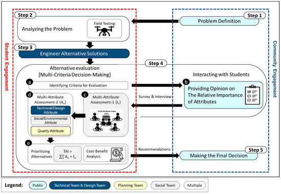 This explains the need for an integrated framework to educate students and future engineers on how to get the public involved in the planning of construction projects. To address this need, this study proposes a framework for educating engineering students to engage the public in the planning of construction projects. This is followed by a case study that involves the engagement of engineering graduate students with the public in the feasibility assessment of various alternatives for a construction project (Suda Wall, Hamilton County, IN, USA). Throughout the case study, students were trained to adopt multi-criteria decision-making (MCDM) to engage community members in the decision-making process.