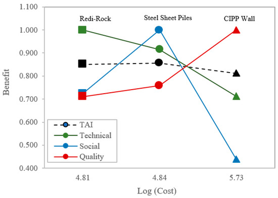 where M is the number of dimensions, and n refers to alternative n. This formula assumes equal weights for the dimensions of each criterion. For instance, noise pollution and vibration caused by construction equipment are two dimensions for the social/environmental criterion. The weight of these two dimensions were considered to be the same. However, the weight of the social/environmental criterion in the overall benefit for an alternative, i.e., TAI, was determined using the survey questionnaire, as discussed in the previous section. It should be noted that the survey questionnaire only asked for the relative importance of the criteria and did not cover the importance of the dimensions under each criterion. This limitation can be addressed in future research studies.