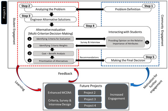 As Figure 1 shows, the community is involved in Steps 1, 4, and 5 of the decision-making process. Furthermore, as color-coded in the figure and discussed in the following sub-section, each of the student groups were responsible for certain steps carried out for the case study.