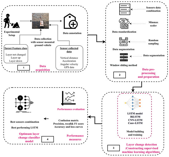 In this research study, a layer change classifier model was developed for detecting the road layer changes along the as-built road using sensors mounted on a UGV and deep learning algorithms. Figure 2 shows the overall framework of the research methodology to detect the road layer change classification. To develop a pavement layer change classifier, the research methodology was proposed and described with four main sections: (1) data acquisition, (2) data preprocessing and preparations, (3) constructing supervised machine learning algorithms, and (4) classifier model performance measures for optimum layer change detection classifier.