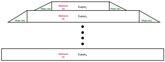 During road pavement construction, three main events were observed for layer change from typical road construction: layer up, layer down, and layer not changed. Road layers can be detected using logical inter-relationships between road pavement layers based on these three events. A large comprehensive dataset is required to train using a deep learning algorithm collected in various pavement construction scenarios consisting of variables to predict the road layer change. With respect to data generation for three main events, typical road construction consists of three main variables (v): road layers (l), corresponding thicknesses (t), and slopes (m), where v ∈ {road layers, thickness, slopes), l∈ {layer1, layer2, layer3, …, layere), t ∈ {thickness1,thickness2,thickness3, …, thicknessg}, m ∈ {slope1,slope2,slope3, …, slopef}. Road layers and their corresponding thicknesses are designed as per the local pavement structure design standards. However, the slope at the edge adjoining two layers is arbitrary and depends on construction practice. Therefore, various slopes and thicknesses were considered to generate the road construction scenarios for dataset generation.