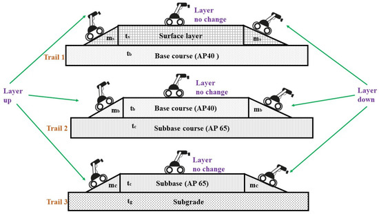 A large dataset is required to develop and train the machine learning classifier model. However, data collection in real construction is expensive in terms of time and cost. This study developed a controlled environment to create the three main events with various road construction scenarios, as shown in Figure 6. For layer change detection, road layers, connecting slopes, and thicknesses of road layers can act as important variables. Initially, four main road design layers were chosen with the most local common practice in Canterbury, New Zealand: (1) surface layer, (2) base course (AP 40), (3) subbase (AP 65), and (4) subgrade. Three trials with various scenario generations were constructed to replicate the real road construction practice: trial 1 (surface layer as upper layer and base course as bottom layer), trial 2 (base course as upper layer and sub-base course as bottom layer), and trial 3 (sub-base as upper layer and subgrade as bottom layer), as seen in Figure 6. Different combinations of road layers with different thicknesses and slopes were designed to generate various scenarios. In particular, different thicknesses of the upper pavement layer and slopes of the edge connecting two layers were used to develop various sub-scenarios. Subsequently, the main three-layer change events ((1) layer up, (2) layer down and (3) no layer change) were created with each created sub-scenario. In this experiment, 54 sub-scenarios were created to represent the main three road layer change events by altering the road layer, thicknesses, and adjoining slopes of two layers. Table 1 shows the various considered values of variables, i.e., thickness and slope for each trail.