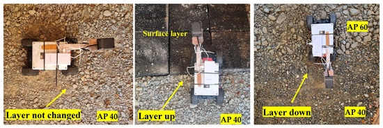 Figure 4 represents the environment of dataset generation, consisting of different road construction scenarios where different road layers with thicknesses were constructed with adjoining slopes to generate the dataset of three events (layer up, layer not changed, and layer down). Three different types of road layer change events were mainly targeted by data generation.
