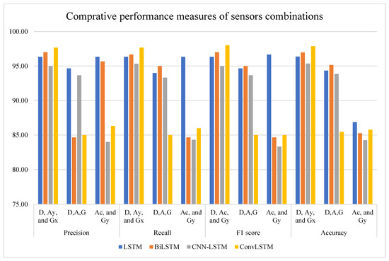 To examine the performance of proposed LSTMs models for various sensors combinations and determine the best sensor combination data, LSTMs models were constructed utilizing data of different sensor combinations, namely, (axyz + gxyz), (axyz + gxyz + D) and (az + gx + D). The performance measures were generated through the implementation of LSTMs on sensors combination. Figure 8 illustrates the comparison of overall accuracy, precision (P), recall (R), and F1 score for sensor combinations. The comparative result shows that the (az + gx + D) model obtained the highest accuracy as 97.88%, followed by (axyz + gxyz + D) through the ConvLSTM model. Furthermore, the LSTM implementation results of average precision, recall, and F1 score with the considered sensor combinations suggest that the combination of (az + gx + D) outperformed other sensor combinations in all model results. The model of acceleration + gyroscope performed poorly compared to (axyz + gxyz + D) and (az + gx + D) for all proposed algorithms.