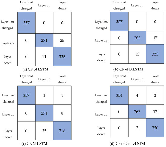 - Figure 9 represents the confusion matrices of the proposed different LSTM models for az + gx + D sensor data. In a confusion matrix, the diagonal cells represent correctly identified events, and off-diagonal classes show misclassified events of specific layer classes. In the resultant confusion matrix of the proposed algorithms, X- and Y-axes depict the predicted and true classes. As shown in Figure 9, the proposed ConvLSTM outperformed the other LSTM networks with the fewest identification errors.