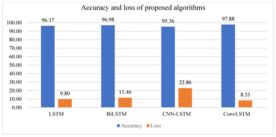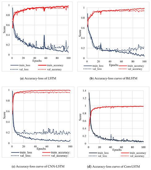 - Model learning curves were plotted to examine the performance of models and obtain the bias–variance tradeoff [37]. Model learning curves illustrate the correlation between accuracy progress with epochs. Figure 10 and Figure 11 shows the recorded accuracy, loss for training, and validation datasets over the iterations for implemented LSTM models. These curves depict the tuning process of parameters with adjustment of the value to examine the accuracy and optimization loss of the considered validation dataset and training dataset. As observed from Figure 10 and Figure 11, the highest test accuracy and least test loss were obtained as 97.88% and 8.33%, respectively, for ConvLSTM. On the contrary, CNN-LSTM registered the lowest accuracy at 95.36% and the highest loss at 22.86%.