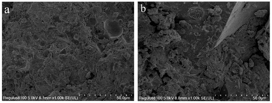 The two groups of cement mortar with substitution amounts of 0% and 15% were analyzed by SEM and XRD to study the effects of the substitution amount of ferrochrome slag powder on the microstructure of cement mortar. The results are presented graphically in Figure 9 and Figure 10.