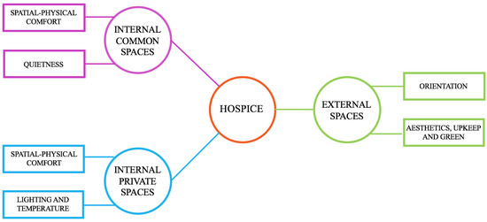 In spite of the growing attention on the impact that physical environment may have on health outcomes, there is a substantial lack of such systematic tools for a specific kind of healthcare environment, represented by the hospice, which is a specific category of healthcare place aimed to improve the life quality of people who are in the last phases of an incurable disease. Hospices work to manage symptoms so that patients may spend their time with dignity and quality, surrounded by their relatives [29]. In a standard hospice, each patient is accommodated in a single room, equipped with a private bathroom and an additional bed for the permanence of family members who assist the person. Usually, rooms are fitted out with refrigerator, television, and armchairs. As concerns the external areas, the building is often surrounded by a garden, whereas inside it is made up of common areas for socialization and leisure (kitchen, living room, reading areas), specific zones dedicated to assistance (nurses’ and doctors’ offices), and patients’ rooms.