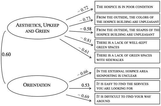 The final model presents the following fit indices: χ2 = 20.23; df = 19; χ2/df = 1.065; RMSEA = 0.023; SRMR = 0.042; NNFI = 0.99; CFI = 0.99. The model includes two correlated factors (see Figure 2). The first factor (F1), “Aesthetics, Upkeep and Green”, includes 5 items (all negative) regarding both the pleasantness and the appearance of the buildings seen from the outside and the presence of cared green spaces in the external area (α = 0.81). The second factor (F2), “Orientation”, consists of three items (two negative and one positive) concerning wayfinding, the possibility to easily find the services, and the clearness of the signage in the external area (α = 0.66).