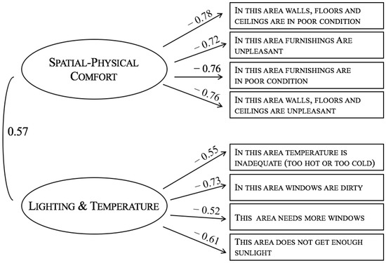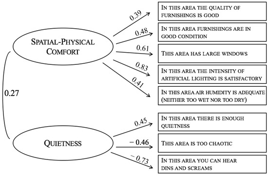 The final model shows the following fit indices: χ2 = 25.97; df = 19; χ2/df = 1.367; RMSEA = 0.054; SRMR = 0.071; NNFI = 0.93; CFI = 0.95. The model includes two correlated factors (see Figure 3). The first factor (F1), “Spatial-physical comfort”, contains five items (all positive) referring to temperature, lighting, and pleasantness of furniture (α = 0.67). The second factor (F2), “Quietness”, includes three items (two negative and one positive) concerning the presence/absence of annoying rumors coming from this area (α = 0.75).