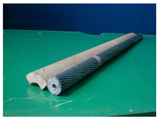 The artificial ice model was constructed of wood with a density of 836.81 kg/m3, which is comparable to real ice. The test diameter of the model was 1:1 smaller than that of the actual conductor model, which had a diameter of 30 mm. The cross-section of the iced conductor is shown in Figure 2. The transmission conductor is shown in Figure 3.