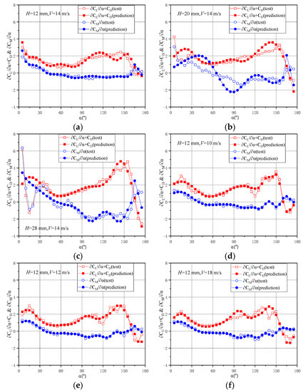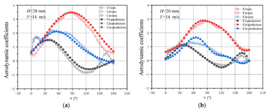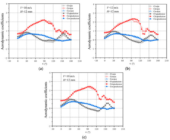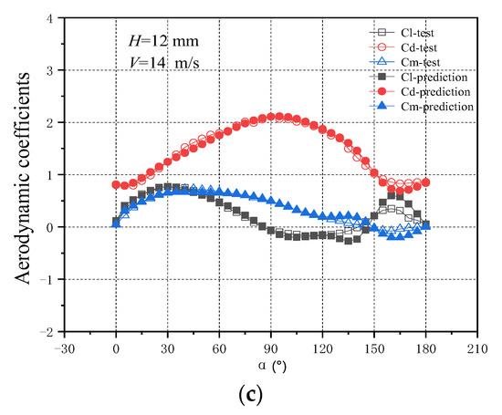 Under the crescent wind speed of 14 m/s, the aerodynamic parameters under the ice thicknesses of 28 mm, 20 mm, and 12 mm were predicted (Figure 6a–c, respectively).
