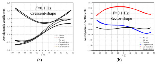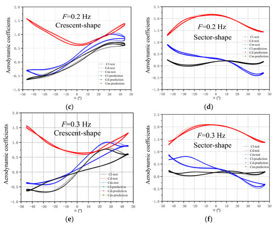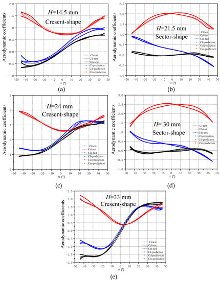 The aerodynamic coefficients from the test results changed in a narrow range and were smooth, as shown in Figure 8a–e, with a good prediction result. The prediction data fit well and met the expectations of the prediction results.