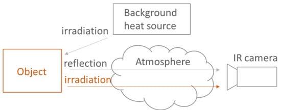 All constants R, B, F, and O are connected to an individual camera chip. Equation (3) can be used as-is for conversion from object signals (counts) to temperature for the ideal state. In this case, W is equal to the flux of radiation. In reality, other effects need to be taken into account, such as background temperature, atmospheric temperature, transmissivity coefficient, and emissivity. Figure 1 shows individual effects that influence measured temperature. Measured flux by an IR camera is composed of the radiant flux originating from the surface of the measured object, the radiation heading to the detector after reflection from the measured surface, and the radiation of the atmosphere between the measured object and the device detector [17]. Furthermore, lenses or protective glass also influence measured temperature. Its effect can be neglected when calibration is performed with it. The problem can occur when lenses or protective glass are switched; this is also the reason why manufacturers give different calibration files for different lenses.