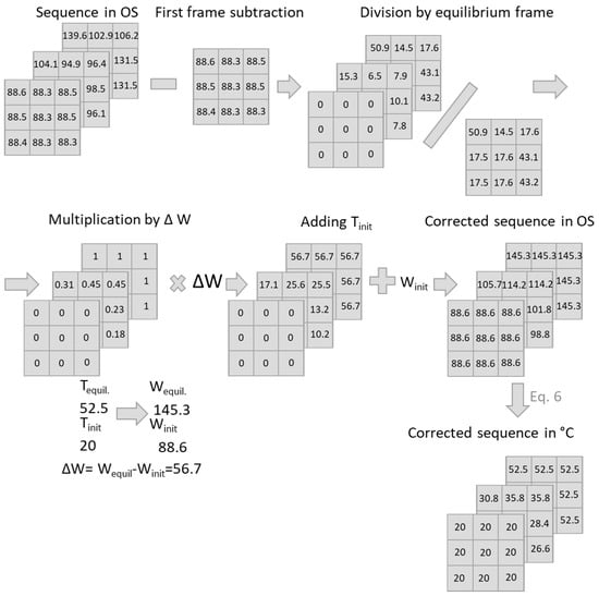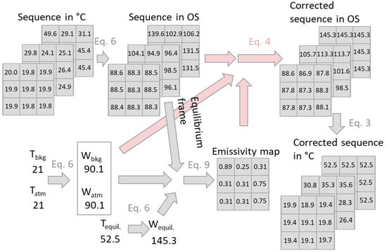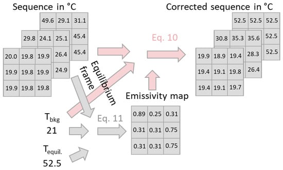 The scheme of method 2 is in Figure 3. The emissivity map is calculated via Equation (11) from the equilibrium frame and background temperature and equilibrium temperature. The corrected sequence is calculated via Equation (10).