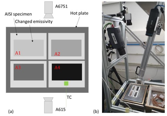 The whole procedure was captured by two infrared cameras. The first camera was bolometric long-wavelength (LWIR) camera FLIR A615 (wavelength range 7.5–14 µm, Noise Equivalent Temperature Difference (NETD) ≤ 50 mK), which represents the most commonly used IR cameras. The second one was a mid-wavelength (MWIR) high-speed high-sensitivity camera, FLIR A6751 (a cooled InSb detector type IR camera, wavelength range 3–5 µm, NETD ≤ 20 mK). The heating was also measured by one thermocouple for verification of the measured temperature. Before this experiment, the homogeneity of heating by hot plate was verified by several thermocouples, which showed the difference in the range of tenths of a degree Celsius. Therefore, the heating was considered homogeneous over the entire hot plate.