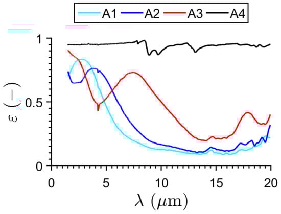 The suitability of these methods for suppression of emissivity influence was determined by comparing the time–temperate curve from zones A1–A3 with reference area A4. Each time, the temperature curve should look similar to A4. Preliminary determination of emissivity was performed with spectrometer Nicolet 6700. The result is in Figure 6.