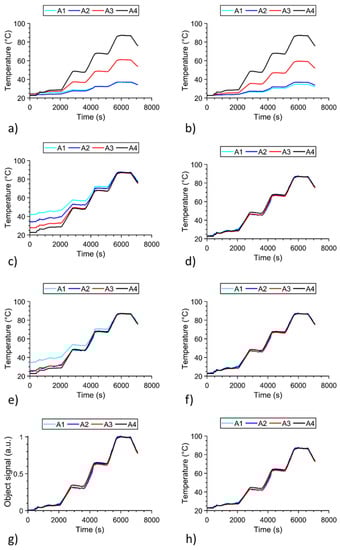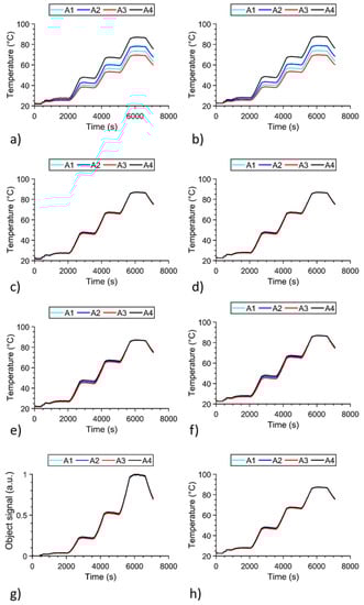 The results of method 3 in OS are in Figure 7g. The same frame that was used for creating emissivity maps for methods 1 and 2 (and with subtracted first frame) in counts was used for the correction. As can be seen, the time OS curves are almost identical. In this case, suppression of emissivity was performed only with knowledge of when thermal equilibrium is reached. It should be clarified that this process can be performed only for object signal values because radiation and temperature do not have a linear dependency. Figure 7h shows that it is possible to convert the OS value back to temperature. Nonetheless, correction must be performed with Equations (16) and (17), which means that initial temperature (radiance) must be known as well as the constants of the RBFO equation and temperature (radiance) at equilibrium.