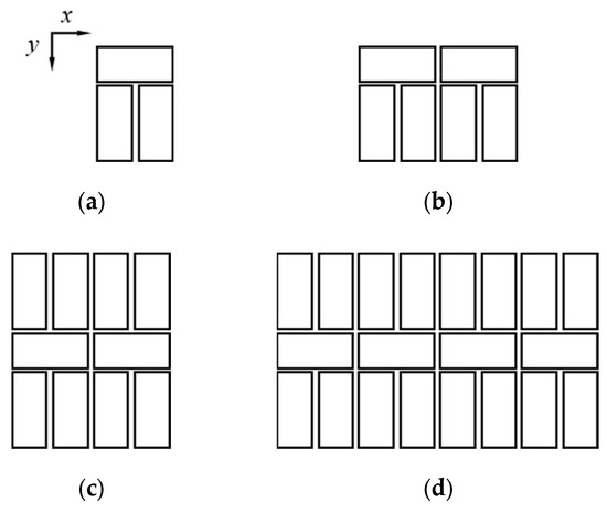 In order to further verify the formula, under the condition that the number of modules is not more than three, the finite element analysis was carried out on the seven different assembly schemes shown in Figure 3 to obtain the lateral stiffness along the x and y directions. A comparison was made with the lateral stiffness calculated by Equation (32). The calculation results are shown in Table 1.