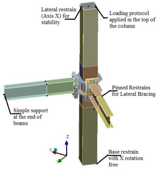 To allow for rotation in the base of the column, a pinned restraint was used at the base. The ends of the beams were established as simply supported, with limited movements in Z direction. Moreover, lateral supports to the beam were applied to comply with the stability bracing members of beams according to [1,5]. The loading was applied at the top of the column for the models studied through lateral displacements. Additionally, instability by displacements out of the plane was solved by incorporating lateral support at the top of the column. In Figure 5, support conditions used in the configuration of the two beams corner (2BC) model are shown. A pretension equivalent to 70% of the bolt tension resistance was applied according to [5] to reproduce the real conditions between the plates (see Figure 6).