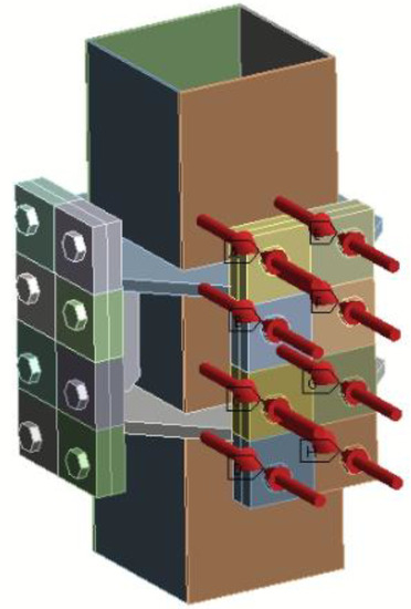 In this research, a “Bonded” contact was employed to simulate welding conditions and restrained contact in all directions. The contact between the end-plates was considered through “frictional” contact to allow relative displacements between them. A friction coefficient equal to 0.3 was established according to [22]. Trial and error was performed to obtain this value [29,30]. A schematic view of contacts in the joint is shown in Figure 8. Moreover, the type of contact by region is reported in Table 4.