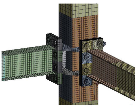 The FEM solves the nonlinear equations using the Newton–Raphson method. Posteriorly, the number of equations is obtained from the number of structure degrees of freedom. Different meshes, sizes, and forms have been used to determine a rational mesh to improve the computational cost. Therefore, the solution adopted uses a fine mesh in zones of interest as high stress or strain regions, specifically in the central zone of the node where the inelastic response is expected, and a coarser mesh in the other regions, as shown in Figure 7.