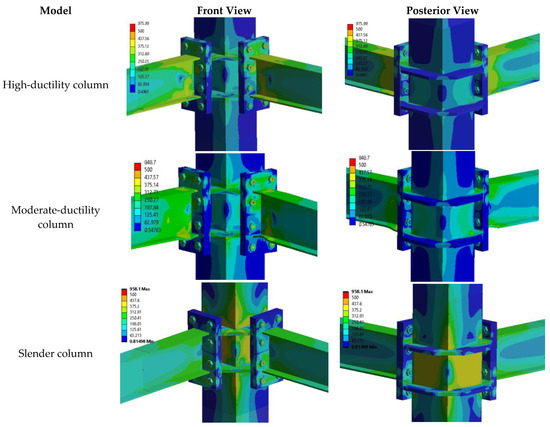 The analysis of the models described in the previous sections displays an equivalent von Mises stress distribution in Figure 10 and Figure 11. These distributions for the different width-to-thickness column ratios show how the stresses increase as the width-to-thickness column ratio decreases.