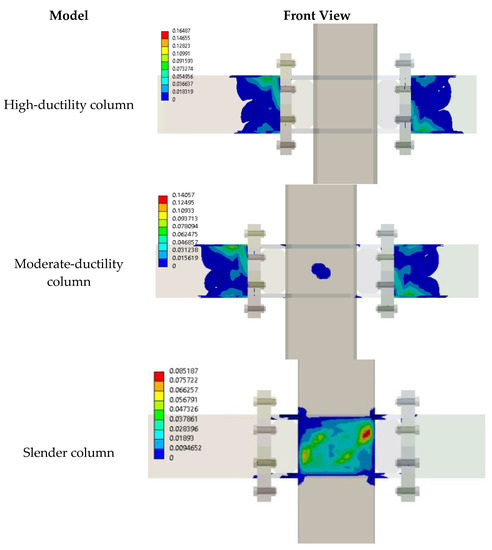 Similar to the previous section, equivalent plastic strains were obtained for all models analyzed and are shown in Figure 12 and Figure 13 for 2BC and 2BI models, respectively. The plastic strain distributions for all high-ductility models show failure mechanisms as plastic hinges at the beams starting from the web yielding to the flange yielding. On the other hand, for moderate-ductility models, plastic hinges are present at the beams. However, a slightly inelastic incursion is shown in the union of the column with the outer annular stiffener and column edges for 2BC models and in the web panel zone for 2BI models.