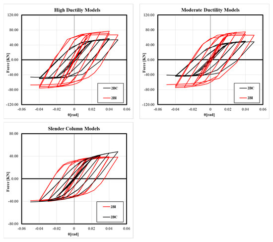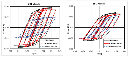 The hysteretic response curves of all models analyzed are shown in Figure 14, where the vertical coordinate F is the load applied on the top of the column and the horizontal coordinate is the drift rotation of the system. In general, for all models, a ductile and stable hysteretic behavior without pinching and degradations in the strength and stiffness. However, as the width-to-thickness column ratio increases, degradations in the stiffness and strength are noted for all models. The strength degradation is greater in the 2BI models, and the stiffness degradation is greater in the 2BC models. This difference is associated with the failure model exhibited by each model, where the 2BI slender model was controlled by panel shear yielding and the 2BC by the outer annular stiffener bending yield. Additionally, the difference between the high-ductility and moderate-ductility models is small in terms of strength and stiffness; the large difference was for the high inelastic cycles of load.