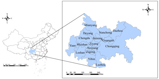 The urban agglomeration of Chengdu–Chongqing is situated in the junction zone of China’s “two horizontal and three vertical” urbanization strategic pattern, which benefits from its advantageous location by linking the east and west with the north and south. It is one of the western regions with the best economic foundation and greatest economic power, and it contributes to the promotion of the west’s development. To achieve the green, coordinated, and sustainable growth of China, it is crucial to accelerate the development of the construction sector in the Chengdu–Chongqing urban agglomeration. The urban agglomeration of Chengdu–Chongqing was chosen as the research object in this study. According to the Development Planning of the Chengdu–Chongqing Urban Agglomeration, this urban agglomeration specifically includes 16 cities, including Chengdu, Zigong, Luzhou, Deyang, Mianyang, Meishan, Yibin, Neijiang, Leshan, Suining, Nanchong, Ya’an, Dazhou, Guang’an, Ziyang, and Chongqing, as shown in Figure 1.