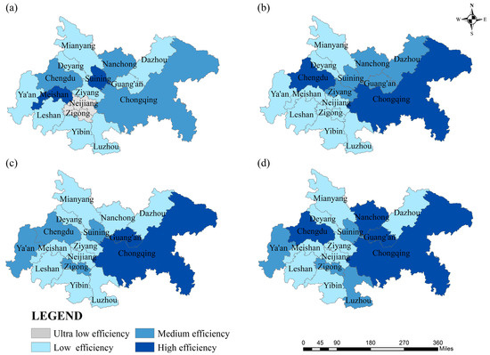 The MATLAB software was employed to determine the green technology innovation efficiency of the construction industry in 16 cities within the study area from 2011 to 2019 using the efficiency evaluation index system developed above. The efficiency value reflects the level of innovation in green technology and differences in the construction industry in each city. The mean and ranking of green technology innovation efficiency in cities from 2011 to 2019 are shown in Table 4 below. By referring to the dividing standards of efficiency measurement in existing studies, the essential values for green technology innovation efficiency are 0.25, 0.5, and 0.75, which are separated into four tiers. Ultra-low efficiency is defined as being less than or equal to 0.25, low efficiency is defined as being between 0.25 and 0.5 (including 0.5), medium efficiency is defined as being between 0.5 and 0.75 (including 0.75), and high efficiency is defined as being greater than 0.75. The geographical and temporal evolution traits of green technology innovation efficiency in the construction industry in the Chengdu–Chongqing urban agglomeration were further examined based on the grade division of efficiency value.