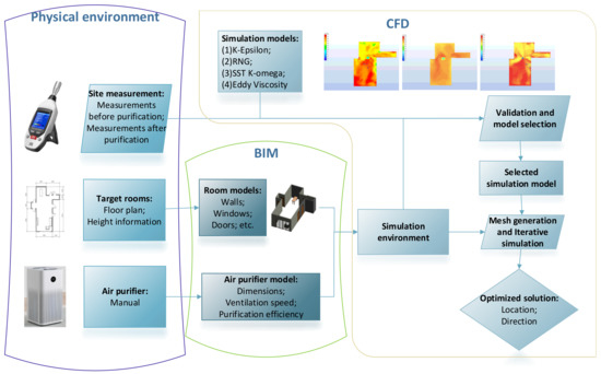 The major contribution of this paper is the CFD-based optimization framework for the operations of air purifiers, in which different turbulence models are validated and the best position for placing an air purifier can be obtained through iterative simulation. Section 2 shows the optimization framework and describes the detailed methodology. Section 3 conducts a case study to demonstrate and validate the proposed optimization framework, and the results are shown and discussed in Section 4. The Conclusions summarize the highlights and limitations of this research.