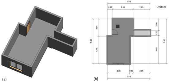 (a) 3D view of the selected room; (b) floor plan of the selected room (unit is m).