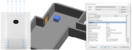 Xiaomi Air Purifier Pro, which is suitable for 21–37 m2 of indoor area, was selected in this study. The maximum ventilation rate of this air purifier is 500 m3 per hour. The direction of the air outlet is vertically upward at the top of the air purifier, while the direction of the air inlet is horizontally inward at the lower part of the air purifier. Detailed properties of the air purifier are shown in Figure 3. BIM models of the tested apartment and the air purifier were generated using Autodesk Revit.