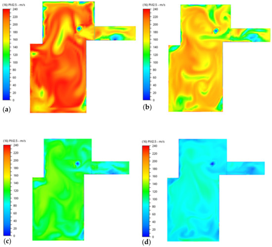 Quantitative results of case 4 are shown in Table 5. Figure 9 shows the simulation results at four time stamps (300 s, 600 s, 1200 s, 1800 s) of case 4. It can be seen that the area near the air purification has relatively lower PM2.5 concentration and the distribution of the PM2.5 concentration gradually becomes uniform as time goes on, and the PM2.5 distribution across the whole room evenly becomes uniform.