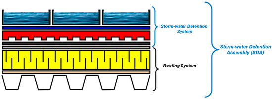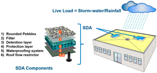 The SDA includes the low-slope roofing system, the water detention components, and the drainage system with the flow control devices. Storm-water captured from precipitation is either ponded as open water or absorbed and stored in a granular medium arranged on the rooftop. SDA may use flow restrictors which slow down the flow of water to the drains. The flow control devices direct the slow discharge of the detained water, effectively slowing down the rate of the volume of rainfall runoff from a site. The SDA can be characterized by how the roof can detain storm-water and can be categorized as Roof-Integrated Design (RID) or Modular Tray Design (MTD) [16,17,18,19,20].