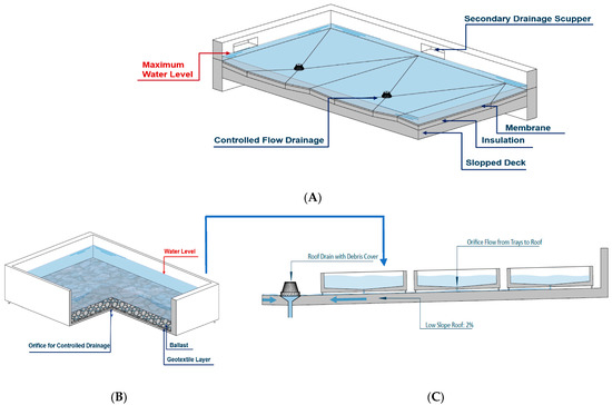 SDA types to detain storm-water: (A) Roof-Integrated Design (RID), (B) Modular Tray Design (MTD), (C) low-sloped roof with MTD.