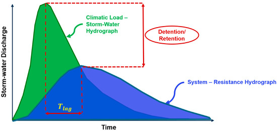 The storm-water detention lag (Tlag) is calculated with metrics related to changes in magnitude or discharge time (Equation (1)). Detention increases with a slower discharge.