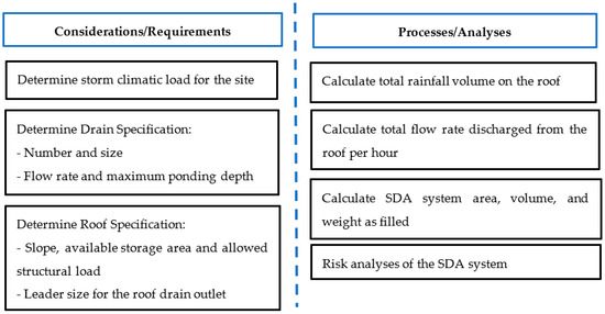 Several variables such as wind, vortices, debris, roof design, roof obstructions, roof slope, micro-bursts, etc. can significantly affect the SDA system design. For instance, designers are advised to determine how the sloped surfaces leading to the drain will affect maximum ponding depth around the drain. However, in general, to design the SDA system, the first step is to determine the design climatic load which is the storm intensity, frequency, and duration. The second step is to determine the drain specifications (number and size; flow rate; and maximum ponding depth) and roof criteria (slope; available storage area; leader size for the roof drain outlet; and maximum live and dead loads allowed on the roof) specifications. The process includes but is not limited to rainfall volume on the roof calculation, total flow rate discharge from the roof per hour estimation, SDA system area, volume, and weight as filled, and risk analyses of the SDA system (Figure 6).