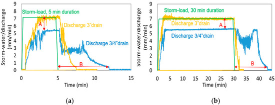 Secondly, a roof with 2 m × 2 m area (6.5 ft × 6.5 ft) is designed and constructed to comply with the National Building Code of Canada (NBCC2015) requirements with slope less than 2%. Two different drain sizes with 3 inch and 3/4 inch are used in this mock-up to analyze the effects of drain size on storm capture and store on the roof. Figure 8 shows the storm-water discharge rate from the mock-up and the time in minutes that take to completely drain water from roof. Figure 8a presents the storm-load in 5 min duration as Figure 8b presents the same storm-load during 30 min. Larger drain diameter (3″ to ¾″) is associated with the drop in peak outflow rate, as A shows the water that is building up on the empty roof during the storm (detention capacity) and B presents an increase in total drainage time. These analyses indicate that water is stored on this roof mock-up during a severe storm for a longer time period when the drain size is smaller (3/4 inch) and thus storm-water takes longer to evacuate the roof.