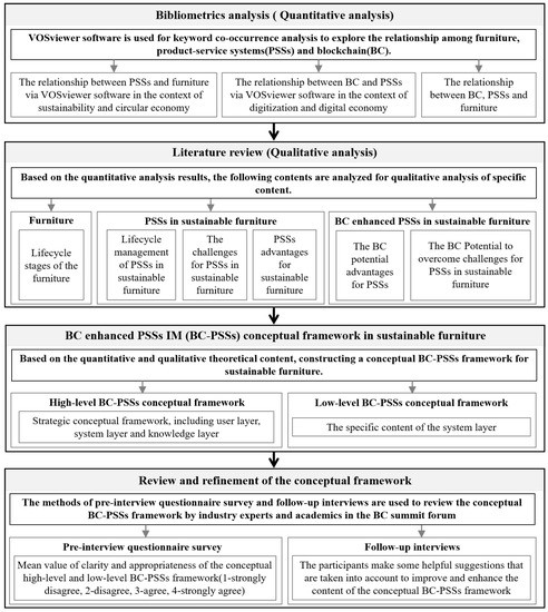 Qualitative analysis was carried out based on the quantitative analysis results. Firstly, the lifecycle stages of sustainable furniture in this study are determined. Secondly, the PSSs is applied to sustainable furniture and the advantages are analyzed. Then, around the whole lifecycle of sustainable furniture, we summarize the current challenges of sustainable furniture PSSs. Finally, we analyze the advantages that BC brings to the PSSs IM framework and integrate BC into PSSs IM to address the challenges related to sustainable furniture. On the basis of quantitative and qualitative analysis, a conceptual BC-enhanced PSSs IM (BC-PSSs) framework is constructed for sustainable furniture, and BC is used to address the challenges related to the lifecycle of sustainable furniture. The conceptual BC-PSSs framework was reviewed by industry experts and scholars in the “Chinese Society of Industrial and Applied Mathematics BC Technology and Application Summit Forum 2021” (CSIAM-BTAF 2021) [78], which helps to further refine the conceptual BC-PSSs framework. The overall structure of this paper is shown in Figure 1.
