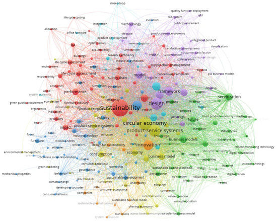 Keywords co-occurrence visualization of furniture and PSSs in the context of CE and sustainability highlighted from the Figure 2 (generated by authors).