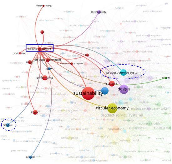 This study aims to understand the current research on furniture and PSSs in developing CE and sustainability and to explore the potential connection between furniture and PSSs. Retrieve TS = (furniture AND circular economy), TS = (furniture AND sustainability), TS = (product–service systems AND circular economy), and TS = (product–service systems AND sustainability) were searched for in the core collection of Web of Science, and 53, 242, 227, and 540 articles were found without the restriction of year, respectively. All the retrieved documents were imported into VOSviewer software for keyword co-occurrence analysis, and the network visualization diagram was generated, as shown in Figure 2. This figure is a visualization of the overall network, which mainly shows the cluster of existing keywords in the search field, as well as the relationship between each keyword. According to Figure 2, the high-frequency keywords (frequency > 100) in this field are mainly “sustainability”, “circular economy”, “design”, “product–service systems”, “innovation”, and “management “. Meanwhile, in the context of CE and sustainability, the keywords closely related to “furniture” include “wood”, “waste”, “management”, “behavior”, “products”, and “attitudes”; additionally, “product–service systems” is mainly closely related to “circular economy”, “business model”, “consumption”, “economy”, and “environmental sustainability” and “barriers”. To further explore the connection between furniture and PSSs, the opportunity to establish the relationship between them is sought in the overall network visualization diagram. Through analysis, it is found that “lifecycle assessment” serves as a bridge to connect “furniture” with “product–service system”, as shown in Figure 3 (Figure 3 is the highlighted map of the overall network visualization in Figure 2).