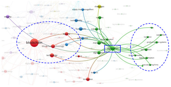 Keywords co-occurrence network visualization of PSSs and BC in the context of digitization and digital economy (detail map) (generated by authors).