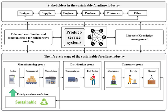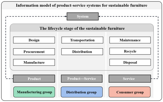 According to the lifecycle stage of sustainable furniture, the specific embodiment of PSSs IM applied to sustainable furniture is shown in Figure 7. “Product” in the PSSs corresponding to the “design stage”, “procurement stage”, and “manufacture stage” of sustainable furniture belongs to “manufacturing groups”. The “transportation stage” and “distraction stage” of sustainable furniture correspond to the “product–service” in the PSSs, which are “distraction groups”. The “maintenance stage”, “recycle stage”, and “disposal stage” of sustainable furniture correspond to “service” in the PSSs, which belongs to “consumer groups”. Finally, the whole lifecycle of sustainable furniture forms a system that combines products and services.