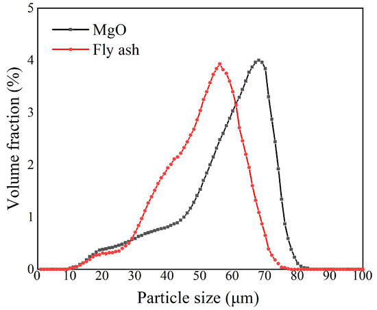 Particle size distribution of calcined magnesia and fly ash.