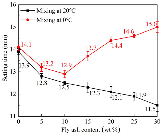 The variation of setting time with mixing temperature and fly ash content.